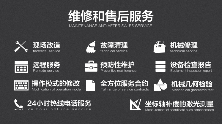 機(ji)床保修期(qi)為一年,保(bǎo)修期從終(zhōng)驗收簽字(zì)起計算。在(zài)質保期内(nei)因産品質(zhì)量問題而(er)造成設備(bei)或部件損(sǔn)壞供方無(wu)償檢修或(huo)更換;質保(bao)期後,供方(fāng)承擔終身(shēn)服務并提(ti)供有償備(bèi)件及技術(shù)服務。