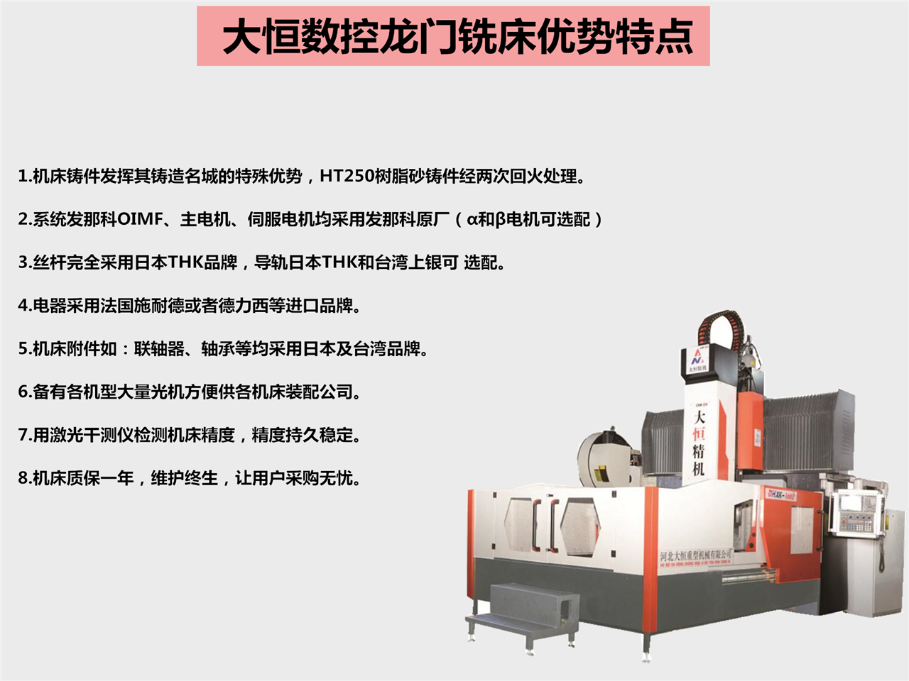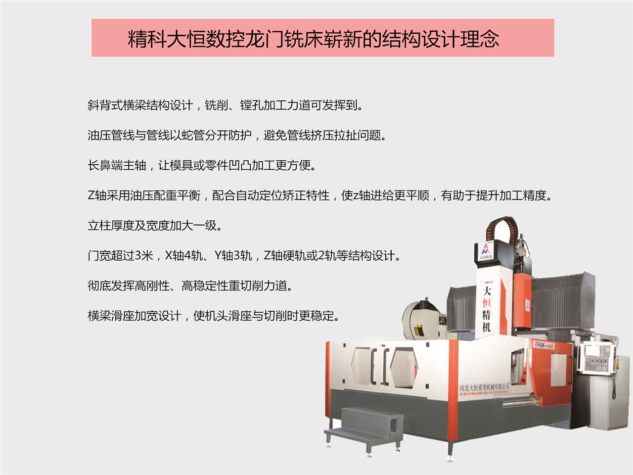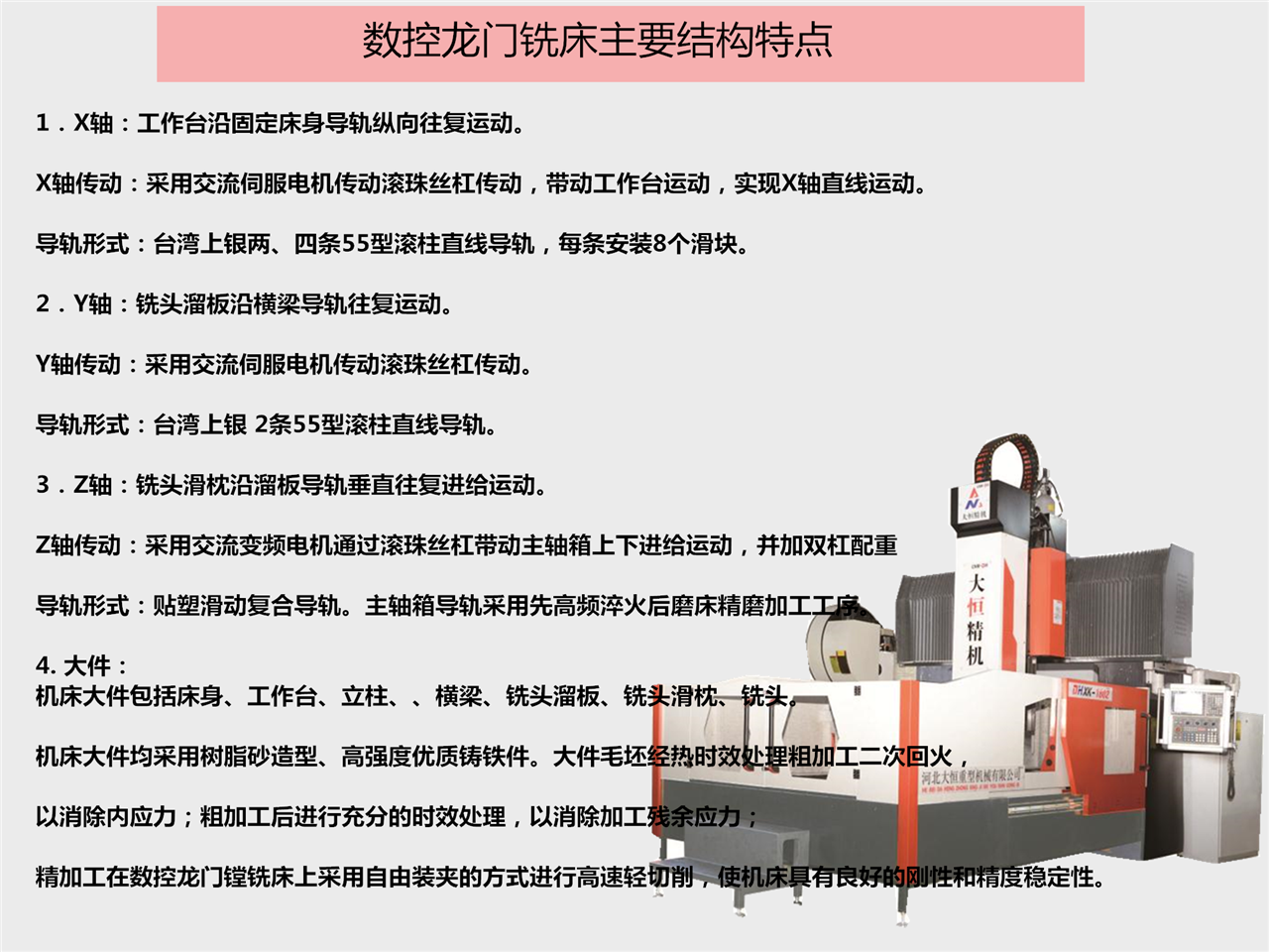 8. 大恒數控龍門銑(xi)床加工範圍:滿足(zú)各種基礎大件、闆(pan)件⭐、殼體件、模具等(deng)多種精密零件的(de)數控加工,工件在(zai)一次裝夾後可持(chí)續㊙️完成銑、镗、鑽、鉸(jiao)、剛性攻絲等多種(zhǒng)工藝的加工。